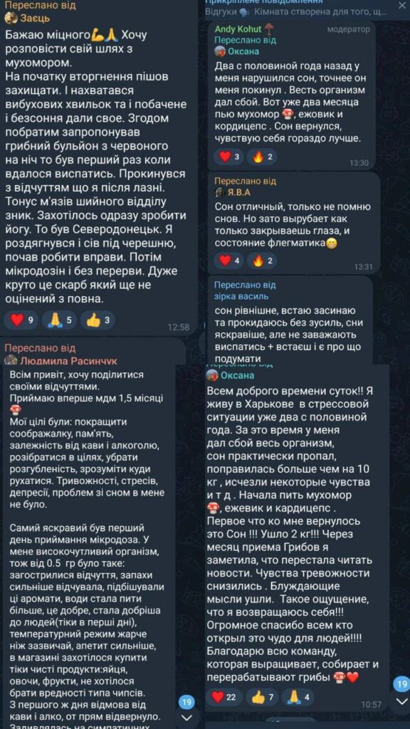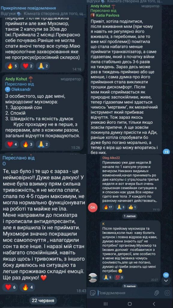 Мікродозинг мухомору червоного вже отримав велику кількість позитивних відгуків від людей, які випробували його на собі. Говоримо про аналіз відгуків від користувачів мухомора в капсулах для мікродозингу в телеграм каналі. Коментарі говорять про поліпшення як фізичного, так і психічного стану, зокрема: