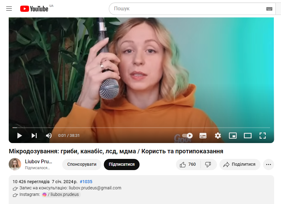Психолог Liubov Prudeus на своєму ютуб-каналі із кількістю підписників 45,1 тисячі користувачів теж висвітлює питання альтернатив мікродозингу та розповідає про власний досвід вживання психоделіків та мікродозингу мухомору. Відео про мікродозинг має понад 10 тисяч переглядів, що свідчить про підвищений інтерес людей до цієї теми та актуальність такої терапії нині.