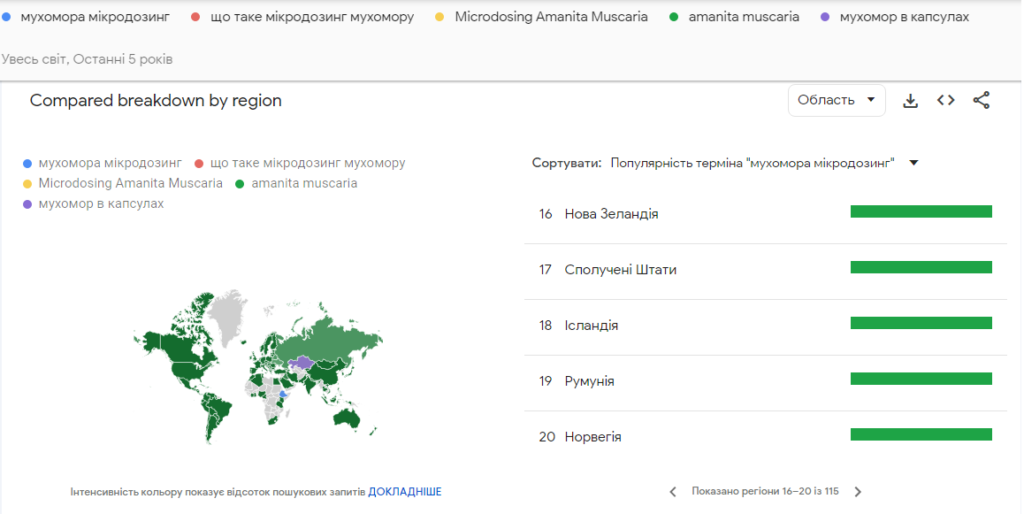 На основі аналізу даних із Google Trends за останні 5 років запити пов’язані з мікродозуванням мухомора (наприклад, “мікродозинг мухомору” або “microdosing Amanita muscaria”) показали зростання інтересу в Україні та світі.